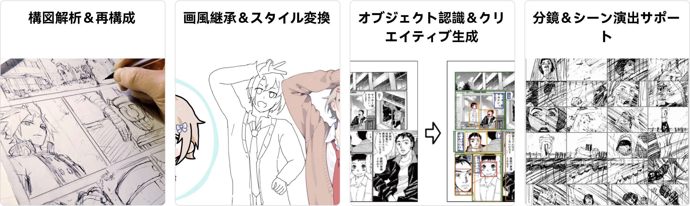 ラフスケッチの補完、塗り自動化、スタイル変換など、AI連携機能で制作工程を大幅短縮。誰でもプロ品質のイラスト・アニメーションを手軽に生成可能です。