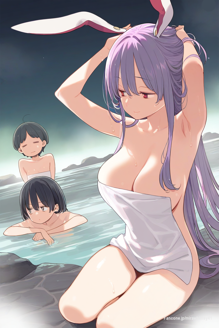 紫の長い髪とうさみみが湯けむりとライトに照らされて、とても魅力的。